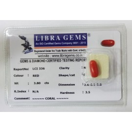 REPORT NO . LCI 336CLARITY . N/ACOLOUR . REDSHAPE / CUT . OVALWT . 3.80 CTSDIMENSION . 2-6.6-1.5-8.R . INDEX . N/AHARDNESS . 3.5COMMENT . CORAL..