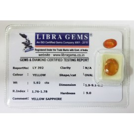 REPORT.NO.LY 392CLARITY.N/ACOLOUR.YELLOWSHAPE/CUT.OVALWT.5.92 CTSDIMENSION.1.9-9.1-5.2R.INDEX.1.76-1.78HARDNESS.9.0COMMENT.YELLOW SAPPHIRE..