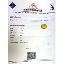 REPORT.NO.LY 576CLARITY.N/ACOLOUR.YELLOWSHAPE/CUT.OVAL WT.5.68 CTSDIMENSION.10.6-7.9-6.5R.INDEX.1.76-1.7.8HARDNESS.9.0COMMENT.YELLOW SAPPHIRE..