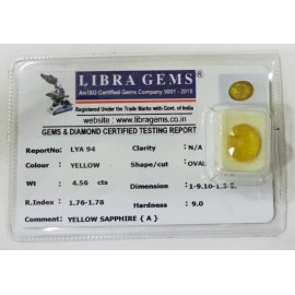 REPORT.NO.LYA 94CLARITY.N/ACOLOUR.YELLOWSHAPE/CUT.OVALWT.4.56 CTSDIMENSION.1.9-10.1-3.5R.INDEX.1.76-1.78HARDNESS.9.0COMMENT.YELLOW SAPPHIRE{A}..