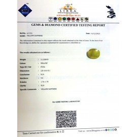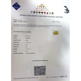REPORT NO . LY-91CLARITY . N/ACOLOUR . YELLOWSHAPE / CUT . OVALWT . 3.19 CTSDIMENSION . 10-1.7-2.4-8.R . INDEX . 1.76-1.78HARDNESS . 9.0COMMENT . YELLOW SAPPHIRE..