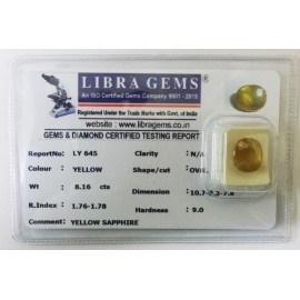 REPORT.NO.-LYA 208CLARITY.-N/ACOLOUR.-YELLOWSHAPE/CUT.-OVALWT.-7.92 CTSDIMENSION.-4-4.1-1.4-4.R.INDEX.-1.76-1.78HARDNESS.-9.0COMMENT.-YELLOW SAPPHIRE { A }..