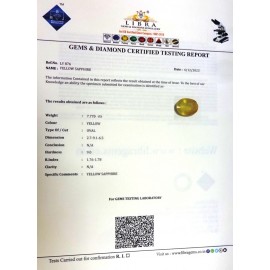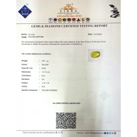 REPORT.NO.-LYA 154CLARITY.-N/ACOLOUR.-YELLOWSHAPE/CUT.-OVALWT.-4.17 CTSDIMENSION.-2-2.9-1.3-4.R.INDEX.-1.76-1.78HARDNESS.-9.0COMMENT.-YELLOW SAPPHIRE { A }..
