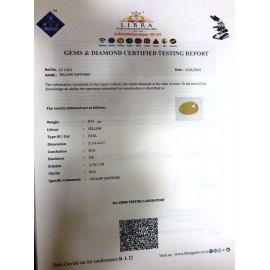 REPORT.NO.LY 629CLARITY.N/ACOLOUR.YELLOWSHAPE/CUT.OVALWT.8.82 CTSDIMENSION.4.9-1.6-4.6R.INDEX.1.76-1.78HARDNESS.9.0COMMENT.YELLOW SAPPHIRE..