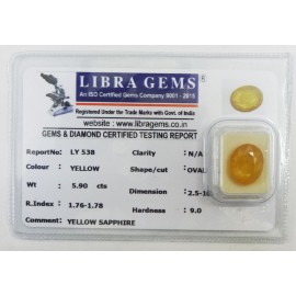 REPORT.NO.LY 538CLARITY.N/ACOLOUR.YELLOWSHAPE/CUT.OVALWT.5.90 CTSDIMENSION.2.5-10.5-4.1R.INDEX.1.76-1.7.8HARDNESS.9.0COMMENT.YELLOW SAPPHIRE..
