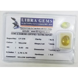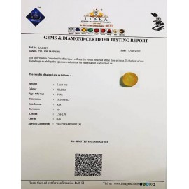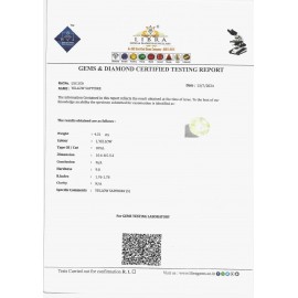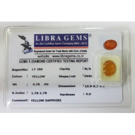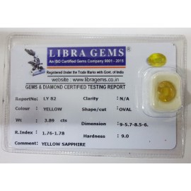 REPORT NO . LYA 38CLARITY . N/ACOLOUR . YELLOWSHAPE / CUT . OVALWT . 3.88 CTSDIMENSION . 10-9.8-8.3-7.R . INDEX . 1.76-1.78HARDNESS . 9.0COMMENT . YELLOW SAPPHIRE { A }..