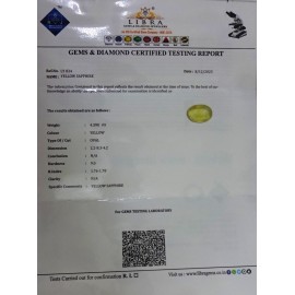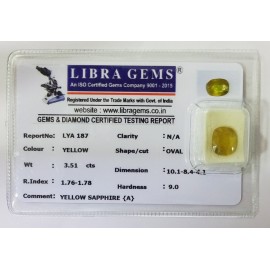 REPORT.NO.-LYA 106CLARITY.-N/ACOLOUR.-YELLOWSHAPE/CUT.-OVALWT.-3.47 CTSDIMENSION.-10-9.9-1.3-3.R.INDEX.-1.76-1.78HARDNESS.-9.0COMMENT.-YELLOW SAPPHIRE { A }..