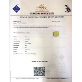 REPORT.NO.LY 657CLARITY.N/ACOLOUR.YELLOWSHAPE/CUT.OVALWT.5.29 CTSDIMENSION.10.7-9.1-5.8R.INDEX.1.76-1.78HARDNESS.9.0COMMENT.YELLOW SAPPHIRE..