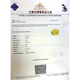 REPORT NO . LY 125CLARITY . N/ACOLOUR . YELLOWSHAPE / CUT . OVALWT . 4.30 CTSDIMENSION . 9-9.8-1.5-1.R . INDEX . 1.76-1.78HARDNESS . 9.0COMMENT . YELLOW SAPPHIRE..