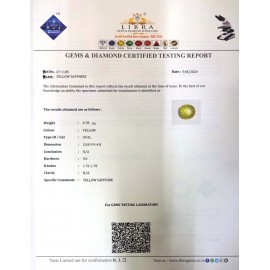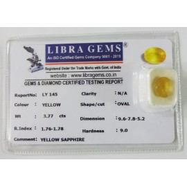 REPORT NO . LY 145CLARITY . N/ACOLOUR . YELLOWSHAPE / CUT . OVALWT . 3.77 CTSDIMENSION . 9-6.7-8.5-2.R . INDEX . 1.76-1.78HARDNESS . 9.0COMMENT . YELLOW SAPPHIRE..