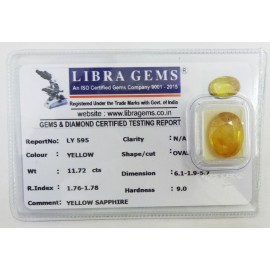 REPORT.NO.LY 595CLARITY.N/ACOLOUR.YELLOWSHAPE/CUT.OVAL WT.11.72 CTSDIMENSION.6.1-1.9-5.7R.INDEX.1.76-1.7.8HARDNESS.9.0COMMENT.YELLOW SAPPHIRE..