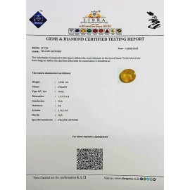 DATE:18-8-2023REF.NO:LY 728NAME:YELLOW SAPPHIREWEIGHT:4.99 CTSCOLOUR:YELLOW TYPE OF/CUT:OVALDIMENSION:1.4-9.2-4.4CONCLUSION:N/AHARDNESS:9.0R.INDEX:1.76-1.78CLARITY:N/ASPECIFIC COMMENTS:..