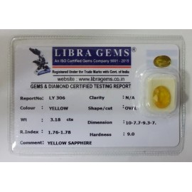 REPORT NO . LY 306CLARITY . N/ACOLOUR . YELLOWSHAPE / CUT . OVALWT . 3.18 CTSDIMENSION . 10-7.7-9.3-7.R . INDEX . 1.76-1.78HARDNESS . 9.0COMMENT . YELLOW SAPPHIRE..