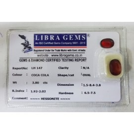 REPORT NO . LH 147CLARITY . N/ACOLOUR . COCA COLASHAPE / CUT . OVALWT . 3.80 CTSDIMENSION . 1-5.8-4.3-8.R . INDEX . 1.92-2.02HARDNESS . 6.5-7.5COMMENT . HESSONITE..
