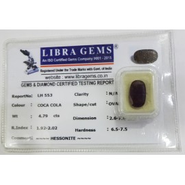 REPORT.NO.-LH 553CLARITY.-N/ACOLOUR.-COCA COLASHAPE/CUT.-OVALWT.-4.79 CTSDIMENSION.-2-6.7-4.5-6.R.INDEX.-1.92-2.02HARDNESS.-6.5-7.5COMMENT.-HESSONITE..