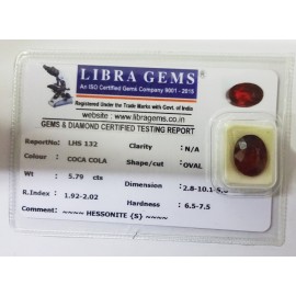 REPORT.NO.-LHS 132CLARITY.-N/ACOLOUR.-COCA COLASHAPE/CUT.-OVALWT.-5.79 CTSDIMENSION.-2.8-10.1-5.6R.INDEX.-1.92-2.02HARDNESS.-6.5-7.5COMMENT.-HESSONITE {S}..