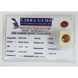 REPORT.NO.-LHS 196CLARITY.-N/ACOLOUR.-COCA COLASHAPE/CUT.-OVALWT.-3.15 CTSDIMENSION.-9-6.8-4.4-4.R.INDEX.-1.92-2.02HARDNESS.-6.5-7.5COMMENT.-HESSONITE { S }..
