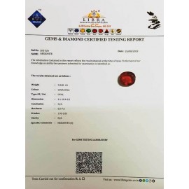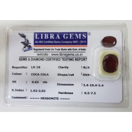 REPORT.NO.LH 762CLARITY.N/ACOLOUR.COCA COLASHAPE/CUT.OVALWT.6.32 CTSDIMENSION.2.2-9.3-6.2R.INDEX.1.92-2.02HARDNESS.6.5-7.5COMMENT.HESSONITE ..