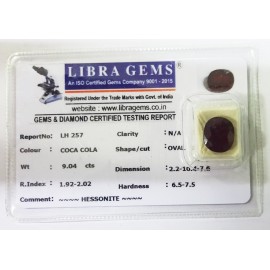 REPORT.NO.-LH 452CLARITY.-N/ACOLOUR.-COCA COLASHAPE/CUT.-OVALWT.-8.75 CTSDIMENSION.-3-7.9-8.6-9.R.INDEX.-1.92-2.02HARDNESS.-6.5-7.5COMMENT.-HESSONITE..