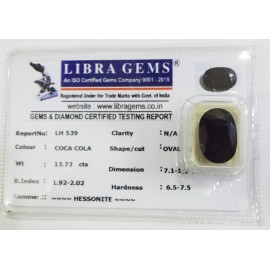REPORT.NO.LH 539CLARITY.N/A COLOUR.COCA COLA SHAPE/CUT.OVAL WT.13.73 CTS DIMENSION. 7.1-1.6-7.7R.INDEX.1.92-2.02HARDNESS.6.5-7.5COMMENT.HESSONITE..