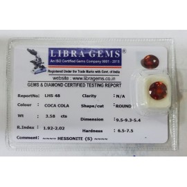 REPORT NO . LHS 48CLARITY . N/ACOLOUR . COCA COLASHAPE / CUT .ROUNDWT . 3.58 CTSDIMENSION . 9-5.9-3.5-4.R . INDEX . 1.92-2.02HARDNESS . 6.5-7.5COMMENT . HESSONITE { S }..