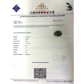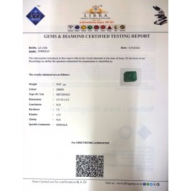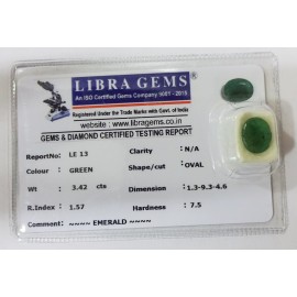 REPORT NO . LE 13CLARITY . N/ACOLOUR . GREENSHAPE / CUT . OVALWT . 3.42 CTSDIMENSION . 1-3.9-3.4-6.R . INDEX . 1.57HARDNESS . 7.5COMMENT . EMERALD..