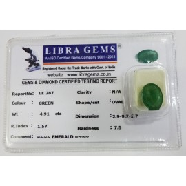 REPORT.NO.-LE 287CLARITY.-N/ACOLOUR.-GREENSHAPE/CUT.-OVALWT.-4.91 CTSDIMENSION.-2-9.9-7.5-7.R.INDEX.-1.57HARDNESS.-7.5COMMENT.-EMERALD..