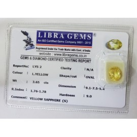 REPORT NO . LYS 2CLARITY . N/ACOLOUR . L . YELLOWSHAPE / CUT . OVALWT . 3.65 CTSDIMENSION . 9-1.7-5.5-4.R . INDEX . 1.76-1.78HARDNESS . 9.0COMMENT . YELLOW SAPPHIRE { S }..