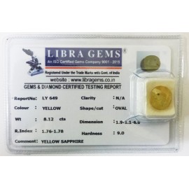 REPORT.NO.LY 649CLARITY.N/ACOLOUR.YELLOWSHAPE/CUT.OVALWT.8.12 CTSDIMENSION.1.9-1.1-6.9R.INDEX.1.76-1.78HARDNESS.9.0COMMENT.YELLOW SAPPHIRE..