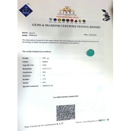 REPORT.NO.-LEJ 180CLARITY.-N/ACOLOUR.-GREENSHAPE/CUT.-OVALWT.-3.40 CTSDIMENSION.-3-1.9-3.4-2.R.INDEX.-1.57HARDNESS.-7.5COMMENT.-EMERALD { J }..