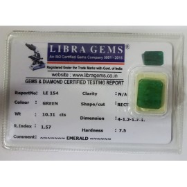 REPORT NO . LE 154CLARITY . N/ACOLOUR . GREENSHAPE / CUT . RECTANGLEWT . 10.31 CTSDIMENSION . 4-1.2-1.7-1.R . INDEX . 1.57HARDNESS . 7.5COMMENT . EMERALD..