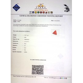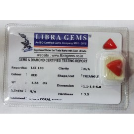 REPORT NO . LCI 129CLARITY . N/ACOLOUR . REDSHAPE / CUT . TRIANGLEWT . 4.78 CTSDIMENSION . 10-6.10-3.6-9.R . INDEX . N/AHARDNESS . 3.5COMMENT . CORAL..