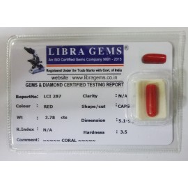 REPORT NO . LCI 287CLARITY . N/ACOLOUR . REDSHAPE / CUT . CAPSULEWT . 3.78 CTSDIMENSION . 5-1.5-1.5-5.R . INDEX . N/AHARDNESS . 3.5COMMENT . CORAL..