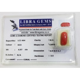 REPORT.NO.-LCI 464CLARITY.-N/ACOLOUR.-REDSHAPE/CUT.-CAPSULEWT.-4.97 CTSDIMENSION.-4-9.6-5.5-7.R.INDEX.-N/AHARDNESS.-3.5COMMENT.-CORAL..
