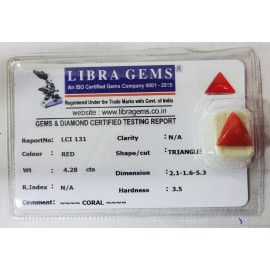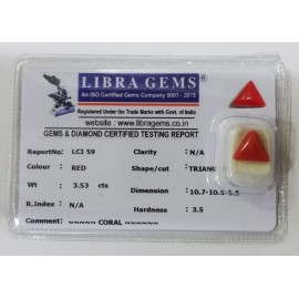 REPORT. NO. LCI 59CLARITY. N/ACOLOUR. REDSHAPE/CUT. TRIANGLEWT. 3.53 CTSDIMENSION. 10.7-10.5-5.5R. INDEX. N/AHARDNESS.. 3.5COMMENT. CORAL ..