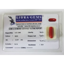 REPORT NO . LCI 289CLARITY . N/ACOLOUR . REDSHAPE / CUT . CAPSULEWT . 3.97 CTSDIMENSION . 5-3.5-4.6-1.R . INDEX . N/AHARDNESS . 3.5COMMENT . CORAL..