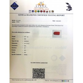 DATE:22-8-2024REF.NO:LCI 1264NAME:CORALWEIGHT:3.00 CTSCOLOUR:REDTYPE OF/CUT:CAPSULEDIMENSION:4.5-5.6-4.9CONCLUSION:N/AHARDNESS:3.5R.INDEX:N/ACLARITY:N/ASPECIFIC COMMENTS:CORAL..