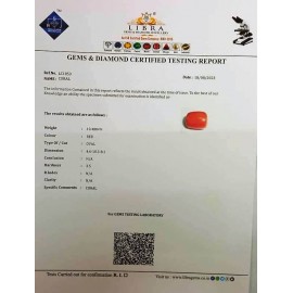 REPORT.NO.LCI 555CLARITY.N/ACOLOUR.REDSHAPE/CUT.CAPSULEWT.6.70 CTS DIMENSION.10.5-6.1-6.1R.INDEX.N/AHARDNESS.3.5COMMENT.CORAL ..