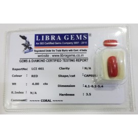 REPORT.NO.-LCI 461CLARITY.-N/ACOLOUR.-REDSHAPE/CUT.-CAPSULEWT.-4.00 CTSDIMENSION.-4-1.6-1.5-4.R.INDEX.-N/AHARDNESS.-3.5COMMENT.-CORAL..