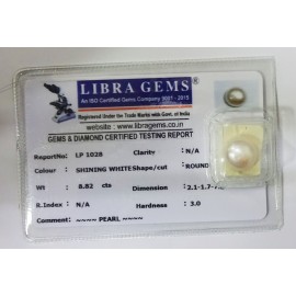 REPORT NO . LP 1026CLARITY . N/ACOLOUR . SHINING WHITESHAPE / CUT . ROUNDWT . 5.21 CTSDIMENSION . 9-8.9-8.6-9.R . INDEX . N/AHARDNESS . 3.0COMMENT . PEARL..