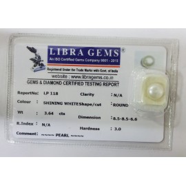 REPORT NO . LP 118CLARITY . N/ACOLOUR . SHINING WHITESHAPE / CUT . ROUNDWT . 3.64 CTSDIMENSION . 8-5.8-5.6-6.R . INDEX . N/AHARDNESS . 3.0COMMENT . PEARL..