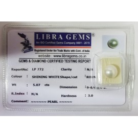 REPORT NO . LP 772CLARITY . N/ACOLOUR . SHINING WHITESHAPE / CUT . ROUNDWT . 5.07 CTSDIMENSION . 9-6.9-8.6-9.R . INDEX . N/AHARDNESS . 3.0COMMENT . PEARL ..