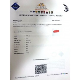 REPORT NO. LCI 17CLARITY. N/ACOLOUR. REDSHAPE/CUT. CAPSULEWT. 6.41 CTSDIMENSION. 10.9-5.2-5.8R. INDEX. N/AHARDNESS. 3.5COMMENT. CORAL..