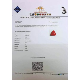 REPORT.NO.LCI 600CLARITY.N/ACOLOUR.RED SHAPE/CUT.TRIANGLE WT.4.00 CTSDIMENSION.10.6-1.5-5.7R.INDEX.N/AHARDNESS.3.5COMMENT.CORAL..