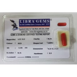 REPORT NO . LCI 313CLARITY . N/ACOLOUR . REDSHAPE / CUT . CAPSULEWT . 3.46 CTSDIMENSION . 4-5.5-1.5-6.R . INDEX . N/AHARDNESS . 3.5COMMENT . CORAL..