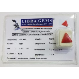 REPORT.NO.LCI 440CLARITY.N/ACOLOUR.REDSHAPE/CUT.TRIANGLEWT.3.32 CTSDIMENSION.1.4-1.1-4.7R.INDEX.N/AHARDNESS.3.5COMMENT.CORAL..