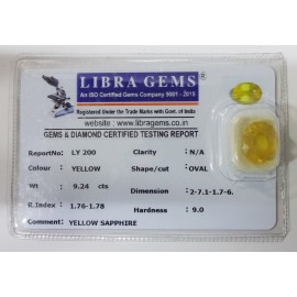 REPORT NO . LY 200CLARITY . N/ACOLOUR . YELLOWSHAPE / CUT . OVALWT . 9.24 CTSDIMENSION . 2-7.1-1.7-6.R . INDEX . 1.76-1.78HARDNESS . 9.0COMMENT . YELLOW SAPPHIRE..