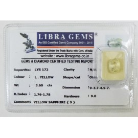 REPORT.NO.LYS 172CLARITY.N/ACOLOUR.L.YELLOW SHAPE/CUT.OVALWT.3.60 CTSDIMENSION.9.3-7.4-5.7R.INDEX.1.76-1.78HARDNESS.9.0COMMENT.YELLOW SAPPHIRE {S}..