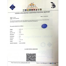 REPORT.NO.LN 847CLARITY.N/ACOLOUR.BLUESHAPE/CUT.OVALWT.5.18 CTSDIMENSION.1.1-9.1-5.2R.INDEX.1.76-1.78HARDNESS.9.0COMMENT.BLUE SAPPHIRE..