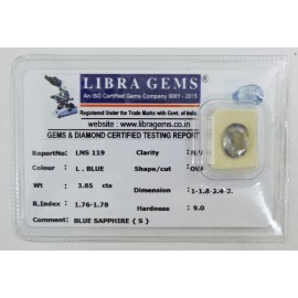 REPORT.NO.LNS 119CLARITY.N/ACOLOUR.L.BLUESHAPE/CUT.OVALWT.3.85 CTS DIMENSION.1.1-8.2-4.2R.INDEX.1.76-1.78HARDNESS.9.0COMMENT.BLUE SAPPHIRE {S}..